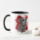 Ein wunderschönes Aquarellportrait eines schwarzen Labrador Retriever hebt sich vor einem hellroten abstrakten Spritzer-Hintergrund ab. Das Bild befindet sich auf zwei Seiten der Tasse, mit Ihrem Namen oder einem anderen benutzerdefinierten Text in schwarz.