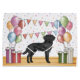 Desteis originelle Cartoon-Illustration eines niedlichen schwarzen Labrador Retriever Zuchthundes. Der Hund wird in einer bunten Geburtstagslandschaft mit pastellfarbenen Geburtstagsballons, Geschenken und einem bunten Banner platziert. Die Pastellfarben Rosa, Grün, Blau, Rot, Orange und lila. Der Hund ist auf einer gelben Holzfußboden-Textur stehend und der Hintergrund hat ein spielerisches pastellfarbenes Polka-Punktmuster.