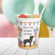 Desteis originelle Cartoon-Illustration eines niedlichen schwarzen Labrador Retriever Zuchthundes. Der Hund wird in einer bunten Geburtstagslandschaft mit pastellfarbenen Geburtstagsballons, Geschenken und einem bunten Banner platziert. Die Pastellfarben Rosa, Grün, Blau, Rot, Orange und lila. Der Hund ist auf einer gelben Holzfußboden-Textur stehend und der Hintergrund hat ein spielerisches pastellfarbenes Polka-Punktmuster. Es gibt auch einen personalisierbaren Textbereich.