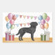 Desteis originelle Cartoon-Illustration eines niedlichen schwarzen Labrador Retriever Zuchthundes. Der Hund wird in einer bunten Geburtstagslandschaft mit pastellfarbenen Geburtstagsballons, Geschenken und einem bunten Banner platziert. Die Pastellfarben Rosa, Grün, Blau, Rot, Orange und lila. Der Hund ist auf einer gelben Holzfußboden-Textur stehend und der Hintergrund hat ein spielerisches pastellfarbenes Polka-Punktmuster.