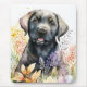 Wunderschönes Aquarellbild eines Black Labrador Retriever Welpendesign mit lila, roten und gelben wilden Blume