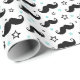 Niedliches Verpackungspapier, das ein Muster der schwarzen Lenkstangenschnurrbärte und der blauen Sterne des Aqua kennzeichnet. Heller und Spaßentwurf. Groß für ein Schnurrbartschlag-Geburtstags-Party oder eine kleine Mannbabydusche. Entwurf und Illustration durch MheaDesign.