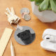 Desteis originelle Cartoon-Illustration eines niedlichen Schwarz-Fell-Mops züchten Hunde Gesicht. Die Hintergrundfarbe ist grau mit einer hellen Dekorationsstruktur. Die Textur kann entfernt werden, wenn dies gewünscht ist. Auf der anderen Seite befindet sich ein personalisierbarer Textbereich für einen Namen oder einen anderen benutzerdefinierten Text.
