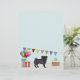 Desteis originelle Cartoon-Illustration eines bezaubernden schwarzen Mantel Farbe Mops züchten Hund. Der Hund ist in einer bunten Geburtstagslandschaft untergebracht. Es gibt einen Geburtstagskuchen mit ein paar Kerzen darauf, bunte Geburtstagsballons und ein buntes Banner sowie zwei Geschenkschachteln. Die Hintergrundfarbe ist hellblau.