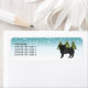 Desteis originelle Cartoon-Illustration eines bezaubernden schwarzen Mantel Farbe Mops züchten Hund. Der Hund ist in einer Winterlandschaft mit drei grünen Tannenbäumen und fallendem Schnee untergebracht. Der Hintergrund ist ein blaues bis weißes Gefälle, das das Design des kalten Wintertages verleiht. Neben dem Hund gibt es einen personalisierbaren Textbereich.