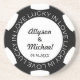 Gedenken Sie Ihre Hochzeit oder Jahrestag mit diesem, das einfach ist, Sandstein-Untersetzer besonders anzufertigen. Ihre Namen und Jahr ist Set auf einen PokerChip-Entwurf. Der Text ", der in der Liebe" glücklich ist, ist Set auf eine Kreismode.