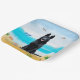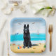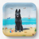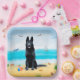 Der schwarze deutsche Schäferhund, der am Strand sitzt, ist eine Geschenkidee für jemanden, der diese Hundezüchtung Liebe hat.