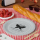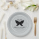 Schwarze Butterfly-Papierplatte mit einem eleganten schwarzen Schmetterling mit ausgebreiteten Flügeln und zwei geschmeidigen Antennen, alle auf einem hellgrauen Hintergrund und innerhalb eines runden weißen Randes, mit eigenem Text. © Morning 6