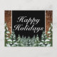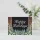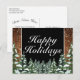 Happy Holidays Gruß Postkarte. Rustikales braunes Holz, schneebedeckter Hintergrund und schneebedeckter Wald. Gemütlicher Vintager Landstil. In unserem Shop sind weitere Artikel in diesem Stil erhältlich. Sie können das Design weiter bearbeiten, Farben, Schriftart ändern und zusätzlichen Text hinzufügen, indem Sie auf den Link "Weiter anpassen" klicken.