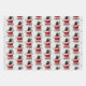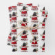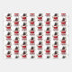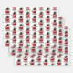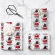 Das wiederholte Muster auf diesen Weihnachtsblättern ist ein Bild eines schwarzen Spitzes, der aus einer rot-weißen Weihnachtsgeschenktüte herausguckt. Hinter ihm steht ein Gezeter aus heiligen und roten Beeren. Stilisierter, roter und schwarzer Büffel karierter Text sagt MERRY CHRISTMAS". Der Hintergrund auf zwei der Blätter in diesem Set ist weiß, während das dritte Blatt silber ist.