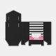 Elegante Brautparty-Gefälligkeitsboxen mit einer schicken rosa und schwarzen Farbpalette, mit einer schwarz-weiß gestreiften Frontplatte und einer Zusammenstellung von Aquarellpeony-Blume in magentafarbenem Rosa und Rose Quarz, einer Farbe des Jahres 2016. Fügen Sie den Ehrengast mit Namen, Veranstaltungstyp und Datum in die Koordination der schwarzen Schrift ein.