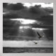 Ein wunderschönes Schwarz-Weiß-Poster eines ruhigen Ozeans, in dem die Sonne durch die Wolken strahlt und die Vögel über dem Meer fliegen - ideal für jegliche Dekoration auf Zuhause oder im Büro.
