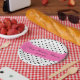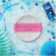 Schwarz-Weiß-Polka-Punkte mit heißen rosa Geburtstagspapieren-Tellern. Schwarzer Polka-Punkt auf weißem Hintergrund und eine heiß rosa Band mit Ihrem Geburtstagstext.