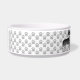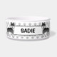 Desteis originelle Cartoon-Illustration einer Schwarz-Weiß-Farbe Sibirien Husky Rasse Hund. Der Hintergrund hat ein Muster von grauen Hundepads und es gibt auch einen personalisierbaren Textbereich für den Namen des Hundes.