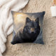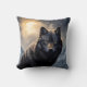 Ein majestätischer schwarzer Wolf mit durchstechenden gelben Augen steht auf einem schneebedeckten Berggipfel und blickt eindringlich auf den Betrachter. Der Wolf ist dick und dunkel, kontrastiert stark mit dem weißen Schnee und dem hellgelben Mond im Hintergrund. Die Szene ist in einem weichen, ätherischen Licht gebadet, das ein Gefühl von Rätsel und Staunen schafft. Perfektes Geschenk für Wölfe und Naturfreunde.
