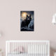 Ein majestätischer schwarzer Wolf mit durchstechenden gelben Augen steht auf einem schneebedeckten Berggipfel und blickt eindringlich auf den Betrachter. Der Wolf ist dick und dunkel, kontrastiert stark mit dem weißen Schnee und dem hellgelben Mond im Hintergrund. Die Szene ist in einem weichen, ätherischen Licht gebadet, das ein Gefühl von Rätsel und Staunen schafft. Perfektes Geschenk für Wölfe und Naturfreunde.