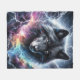 Eine atemberaubende Darstellung eines schwarzen Wolfs, der in einem lebendigen Himmel auftaucht, umgeben von dramatischen Blitzen und farbenfrohen kosmischen Wolken.
