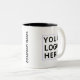 Schwarzes Firmenlogo und Name auf einer weißen Mar Zweifarbige Tasse