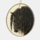 Schwarzes Friesisches Pferd mit einer langen, gewölbten Mähne mit warmen gelben Highlights aus dem späten Nachmittagssonnenlicht. Realistisches Kunstwerk aus einem originalen Ölgemälde des Pferd- und Wildtierkünstlers Crista S. Forest.