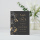 Diese elegante moderne Hochzeit speichern die Dattelkarte mit einem Rand von schwarzen Blume und goldenen Imitaten Folie Blätter. Passen Sie den goldfarbenen Text auf einem schwarzen Hintergrund mit dunklem Schiefer an. Die Rückseite der Karte ist schwarz aus massivem Schiefer.