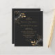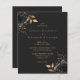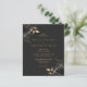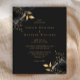 Die romantische Blumenzetteleinladung mit schwarzblühenden Blumenbouquets mit goldenem Imitat-Foliage in zwei Ecken lädt zum Set ein. Die Namen des Ehepaares erscheinen im klassischen, goldfarbenen Serif-Schriftart, der übrige Text kursiv auf schwarzem Hintergrund. Die Rückseite der Karte ist schwarz aus massivem Schiefer.