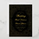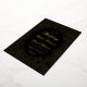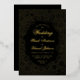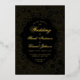 Eine elegante Hochzeitseinladung mit schwarzen und goldenen Hochzeitsfarben. Der Hintergrund ist schwarz. Der Text und die Dekorationen sind in realer Folie (der Standardwert ist Gold). Der Text ist in einem goldfarbenen Rahmen mit schwarzen Blume auf goldenem Hintergrund geschrieben, mit dem Wort Hochzeit und den Namen in einem eleganten kalligrafischen Skript geschrieben, die Erholung in kleinen Kappen. Die erste Zeile, "Sie sind eingeladen", ist ein gewölbter Text über dem Wort Hochzeit.