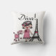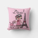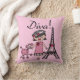 Diva-T-Shirts, Bodysuits, Becher, Taschen, Karten, Aufkleber, Schlüsselketten, Kissen, Wanduhren und viel mehr mit einem niedlichen Divaentwurf, der ein schwarzes behaartes Mädchen in einem Hut und in einem rosa Kleid mit ihrem rosa Pudel nahe dem Eiffel-Turm kennzeichnet!