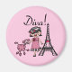 Diva-T-Shirts, Bodysuits, Becher, Taschen, Karten, Aufkleber, Schlüsselketten, Kissen, Wanduhren und viel mehr mit einem niedlichen Divaentwurf, der ein schwarzes behaartes Mädchen in einem Hut und in einem rosa Kleid mit ihrem rosa Pudel nahe dem Eiffel-Turm kennzeichnet!