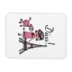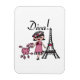 Diva-T-Shirts, Bodysuits, Becher, Taschen, Karten, Aufkleber, Schlüsselketten, Kissen, Wanduhren und viel mehr mit einem niedlichen Divaentwurf, der ein schwarzes behaartes Mädchen in einem Hut und in einem rosa Kleid mit ihrem rosa Pudel nahe dem Eiffel-Turm kennzeichnet!