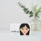 Desteis coole Cartoon Illustration einer wunderschönen Frau mit langen schwarzen Haaren und starkem Make-up. Die Augen des Mädchens öffnen ihre dunkelgläserne Augape, ihre Wangen haben einen kleinen rosa Schatten und ihre Lippen sind in heißen Rosa gehalten. Neben dem Bild befinden sich personalisierbare Textbereiche für einen Namen. Auf der anderen Seite gibt es einen anderen personalisierbaren Textbereich für weitere Kontaktinformationen wie Adresse und Telefonnummer. Es gibt auch eine kleine Abbildung von Lippen in einer Ecke.