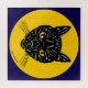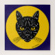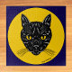Eine retro aussehende Illustration des Gesichts einer schwarzen Katze mit gelben Augen erscheint in einem mondähnlichen Kreis in dieser original Halloween-Passenden Kunst von Richard H. Fay.