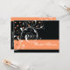 Elegantes, blumenblättriges schwarzes Korallenblatt blüht ein Brautparty für Hochzeitsfeiern. Weiße Blätter, Wirbel, Gardinen und orangefarbene Korallen auf schwarzem Hintergrund. Es gibt ein Korallenband mit dem Text unten. Elegantes, stilvolles und elegantes Design, ideal für eine Winterhochzeit.
