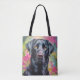 Ein beeindruckendes, modernes Kunstportrait eines Set aus schwarzem Labor vor einem abstrakten, rosa und grünen Garten. Die dunkle Silhouette des Hundes kontrastiert wunderbar mit den lebhaften, wirbelnden Gartenfarben, die Natur und Tier in einem ausdrucksvollen, zeitgenössischen Stil vereinen. Die abstrakten Pinselstriche schaffen ein Gefühl von Bewegung und Energie und machen dieses einzigartige Stück spielerisch und visuell faszinierend.