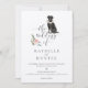 Schöne Hunde Thema Hochzeit Einladung mit unserer handgemalten Aquarell Schwarz Labrador Illustration. Der bezaubernde Black Labrador ist mit einer schönen rosa Rose, weißen Blumen und einem grünen Kranz ausgestattet, der den Hund schmückt. Einfaches, sauberes und elegantes Design mit eleganten Blumenarrangements ergänzen das Design. Speziell für Hundefreunde, Hundebesitzer, Paare mit Hund oder Hunde, die sich mit Ihren Namen und zusätzlichen Hochzeitsdetails für eine wunderschöne Hochzeitseinladung auskennen. Alle Illustrationen sind Originalwerke von Moodthology Papery.