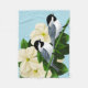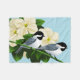 Zwei schwarze mit einer Kappe bedeckte Chickadees hockten auf einer Niederlassung des blühenden Hartriegels, hellblauer Hintergrund