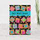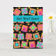 Senden Sie diese "Get Well bald"-Karte an einen Quilter- oder Quilt-Liebhaber mit dieser farbenfrohen, anpassbaren Grußkarte. Sie können die Wörter auf der Vorderseite ändern, um Ihre eigenen Wörter und Namen hinzuzufügen. Die Stimmungswörter in der Karte können auch an Ihre eigenen Worte angepasst werden. Diese originelle Quilt-Kunst macht eine lebendige Farbnote oder Grußkarte. Quilt art basiert auf originalen Kunstwerken und bietet beliebte Quiltblöcke wie eine Blockhütte, ein Pinrad und einen Stern sowie einzigartige Blöcke in lebhaften und dynamischen Farben wie Orange, Gelb, Rosa, Türkis und Kalkgrün, die den Pop auf einem schwarzen Hintergrund für eine schöne Farbpalette bilden. Ein türkisfarbener aquamariner blauer Streifen steht auf der Vorderseite der Karte, um "Get Well bald" oder einen anderen Gruß Ihrer Wahl zu sagen. Diese Quiltkunst ist eine originelle Kunst aus Stoff und Quilt Designer Phyllis Dobbs. Diese Kunst ist auf anderen Produkten und in mehreren farbigen Hintergründen in diesem Laden mit weiteren Produkten in Phyllis'BusinesswithFlair Store erhältlich. Passend zu koordinierenden Briefmarke, Umschlägen, Aufklebern und Rücksendeadressen-Aufklebern.