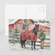 Diese Weihnachtskarte zeigt ein atemberaubendes schwarzes Pferd, das mit einer roten Tartan-Decke zugedeckt ist und neben einem Pfosten steht, der mit einem festlichen Kranz geschmückt ist. Die Szene spielt vor dem Hintergrund einer schneebedeckten Landschaft und einer roten Scheune. Damit ist sie eine ideale Wahl für jeden Pferdefreund oder Besitzer eines Pferdehofs. "KI-generierte Kunst mit Designleitung von Susang6"