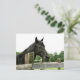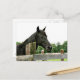 Schwarzes Pferd mit Blick auf eine Foto-Postkarte