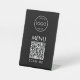 Ein einfaches, schwarzes minimalistisches Schild mit dem QR-Code für die Speisekarte eines Restaurants oder Cafés.