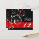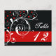 Elegante florale Blätter schwarz, rot geblüht Hochzeitskarte Tischnummer, mit weißen Blättern, Wirbel und Gardinen und roten Punkten auf schwarzem Hintergrund. Es gibt ein rotes Band mit deinem Text unten. Elegantes, stilvolles und elegantes Design, ideal für eine Winterhochzeit.