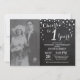 1. Hochzeitsjubiläum mit maßgeschneidertem Foto. Chalkboard Schwarz und Silber Einladung. Khalkboard Schwarz und Silber Glitzer Diamond Hintergrund. Silver Confetti. Erwachsener zum Geburtstag. Geburtstagsparty von Frauen oder Männern. Für weitere Anpassungen klicken Sie bitte auf die Schaltfläche "Anpassen" und verwenden Sie unser Designwerkzeug, um diese Vorlage zu ändern.