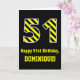 Die Front dieses Spaßes und Aufmerksamkeit-ergreifengrußkartenAusrüstungsbeschreibungen des geburtstages themenorientierten eine große Nr. "51" mit einem gelben und schwarzen Streifenmuster, zusammen mit der Mitteilung "glücklicher 51. Geburtstag," und einem editable Namen. Der Hintergrund der Front wird schwarz gefärbt. Die inneren Eigenschaften eine kundengerechte Geburtstagsgrußmitteilung oder konnten möglicherweise geklärt werden und verlassener freier Raum, wenn eine Mitteilung eigenhändig stattdessen geschrieben werden soll. Eine personalisierte Geburtstagskarte so wäre möglicherweise eine Spaßweise, einer Mitteilung zur Feier jemand ersten Geburtstag fünfzig zu schicken. [~Z0000382]