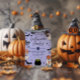 Lade deine Gäste zu einem Halloween-Party mit dieser niedlichen Einladung ein, mit sprichwörtlichen Halloween-Symbolen auf lila Hintergrund und personalisierter schwarzer Typografie.