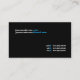 Elegante schwarze Visitenkarte mit blauen Höhepunkten. Aufgeräumter Blick erwähnt Professionalismus und Kreativität. Ausgezeichnet für verschiedene Fachleute im Geschäft sowie kreative Industrien, die einfache Eleganz und Art in den Promotionsmaterialien bevorzugen. Erstklassiges oder Luxuspapier empfohlen für besten Blick und Gefühl.