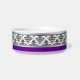 Elegantes Schwarzweiss-Damastmuster entwarf durch Liz Molnar auf Haustierschüssel mit silbernem Band, Aufkleber, kundengerechtem Text und blassen Streifen auf dem variablen Farbhintergrund.