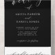 Elegante trendige Schwarz-Weiß-Einladungen in einer Hochzeitseinladung mit klassischer formaler UAWG mit "Hochzeit von" Texten in schicken handschriftlichen Kalligraphie-Skripten. Personalisieren Sie es mit Ihren Daten auf beiden Seiten! +++++++++++ Diese zeitlose Hochzeitsveranstaltung eignet sich für moderne Hochzeitsfeiern und Empfänge.