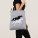 Stilvolle Schwarz-Weiß-Silhouetten auf der silbergrauen Tote-Tasche. Pferde symbolisieren die Kraft des Geistes der Natur.
