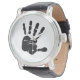 Eine Uhr, die auf weißem Hintergrund einen schwarzen Handdruck oder einen Palmdruck zeigt. Die Einrichtung ist einfach, schwarz und weiß.