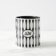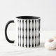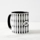 Hübsches Schwarz-Weiß-Muster, schwarzer Griff und Interieur. Wir haben diese schwarz-weiße Tasse vorgestellt, um Ihnen die Eingabe eigener Initialen oder Monogramme zu erleichtern. Wir haben dieses Muster auch in anderen Zuhause- und persönlichen Produkten, sowie in anderen Schwarz-Weiß-Mustern in unserer Schwarz-Weiß-Kollektion.