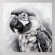 Dieses Stück ist eine auffallende schwarz-weiße Skizze eines Aras, mit unglaublichem Realismus dargestellt. Der Künstler hat eine Mischung aus Bleistift und Kohle benutzt, um die komplizierte Textur seiner Federn und den intensiven Look in seinem Auge zu erfassen. Die Schattierung auf dem Schnabel zeigt feine Risse und Schatten, was ihm eine dreidimensionale Qualität verleiht. Der Hintergrund der Zeichnung ist eine lockere, abstrakte graue Wäsche, die das detaillierte Thema noch mehr hervorhebt.